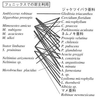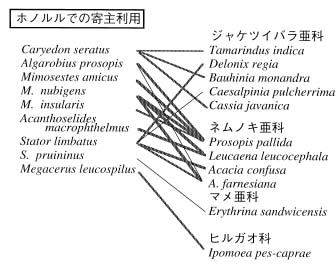 図2.合衆国ハワイ州ホノルル市(図2a)とアリゾナ州フェニックス市周辺(図2b)におけるマメゾウムシと寄主となるマメ科を線で結んだ相関図。3段階の線の太さは,それぞれ利用度(1〜3,本文参照)に対応する。線の引いてないものは羽化が見られなかったことを示す。