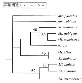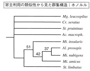 図3.寄主植物利用のニッチ類似度に基づく最節約デンドログラム。Phylip 3.5 cを使って計算された。これがマメゾウムシの群集(ギルド)構造を表し,ホノルル市(図3a)とフェニックス市(図3b)とを比較すると,1:多の関係がより頻繁に見られるフェニックス市の方で構造化が発達している。属の略記は,Mg: Megacerus, Cr: Caraydon, St: Stator, Ac: Acanthoselides, Mi: Mimosestes, Al: Algarobius, Am: Amblyserus, Nl: Neltimius を示す。デンドログラム中の数字はブートストラップ500回のうちその枝が支持された割合(%)を示す